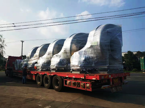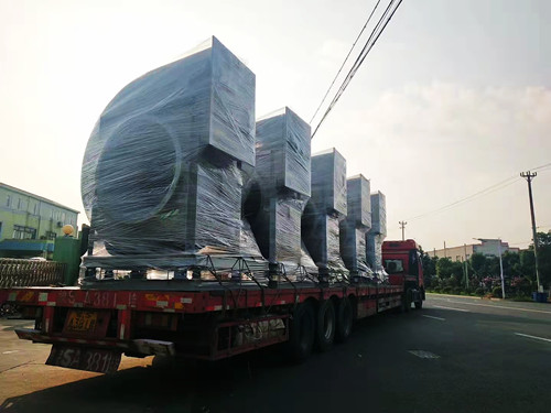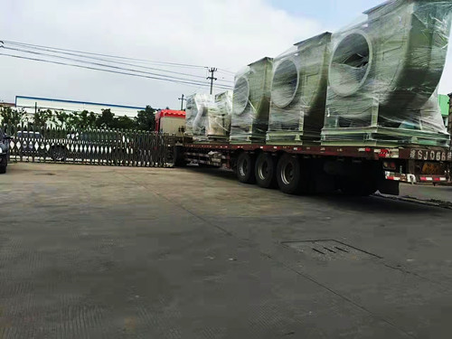 風(fēng)機(jī)的整體尺寸會隨著型號的變大而增加,但是從運(yùn)輸與安裝的角度考慮,一般最大型號的玻璃鋼離心風(fēng)機(jī)高度極限為3米左右。這種型號的風(fēng)機(jī)對應(yīng)為14C,長度在2.5-3.5米左右,高度在3米左右。如果需要處理的風(fēng)量比較大,可使用多臺風(fēng)機(jī)搭配使用。下面是多臺大型號的玻璃鋼離心風(fēng)機(jī)發(fā)貨圖。