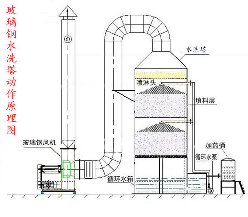 洗滌塔即將廢氣中的雜質(zhì)清除,以煤炭燃燒廢氣處理為例,首先,廢氣有管道進(jìn)入塔體底部,與由上至下的噴淋液體進(jìn)行充分接觸,將廢氣中含有的灰塵過濾掉,流入底部的水槽內(nèi),氣體繼續(xù)往上走,根據(jù)廢氣量的大小選擇處理的次數(shù),經(jīng)過隔離層與形成膜狀的液體繼續(xù)清洗,如此反復(fù),直至進(jìn)入塔體頂部的除霧層,將氣體中含有的水分過濾之后,有管道經(jīng)由玻璃鋼離心式風(fēng)機(jī)排出。